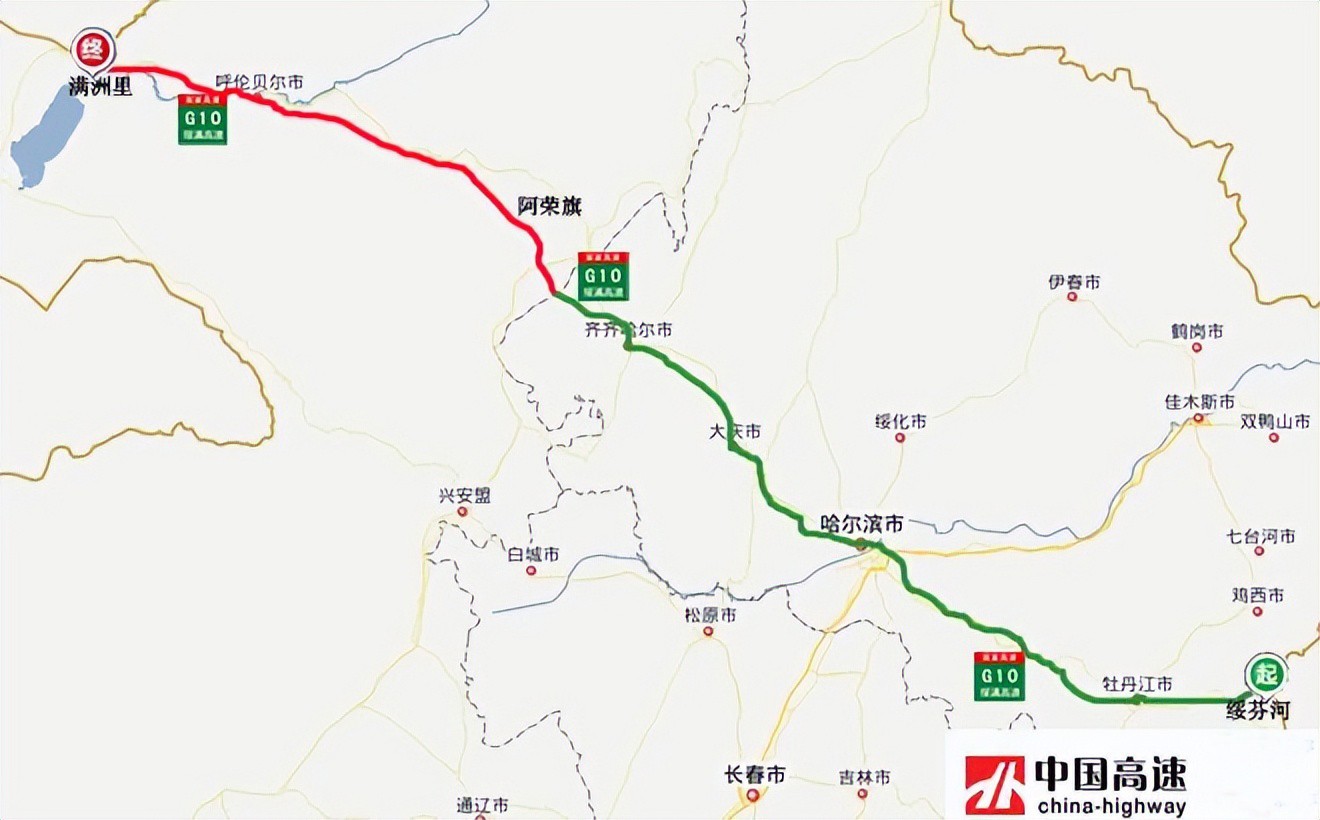 绥满高速(G10):从黑龙江省绥芬河市通往内蒙古满洲里市,中途经过绥芬河-牡丹江-哈尔滨-齐齐哈尔-呼伦贝尔-满洲里等市,途经黑龙江、内蒙古2省区,全长1527公里,开车从绥芬河到满洲里需15个小时。