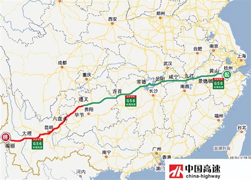 杭瑞高速(G56):从浙江省杭州市通往云南省瑞丽市,中途经过杭州-黄山-景德镇-九江-咸宁-岳阳-常德-吉首-遵义-六盘水-昆明-大理-瑞丽等市,途经浙江、江西、湖北、湖南、贵州、云南6省,全长2956.225公里,开车从杭州到瑞丽需29个小时。