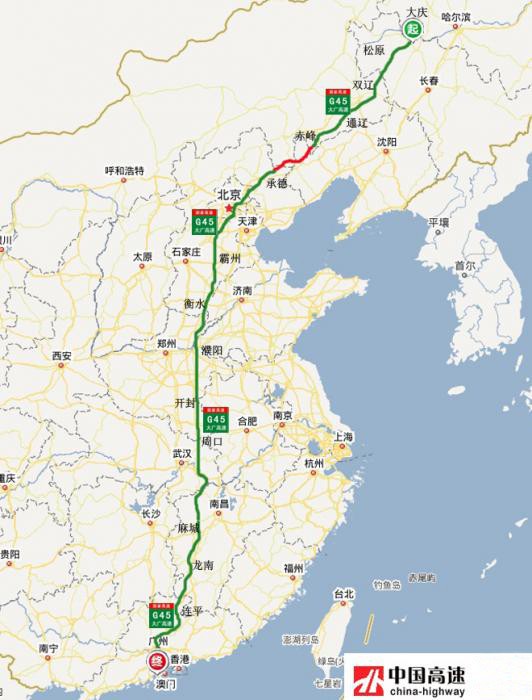 大广高速(G45):从黑龙江省大庆市通往广东省广州市,中途经过大庆-松原-通辽-赤峰-承德-北京霸州-濮阳-周口-黄石-新余-赣州-连平-广州等市,是从东北经华北到华南的一条重要干线,途经黑龙江、吉林、内蒙古、北京、河北、河南、湖北、江西、广东等9个省区市,全长3437公里,开车从大庆到广州需35个小时。