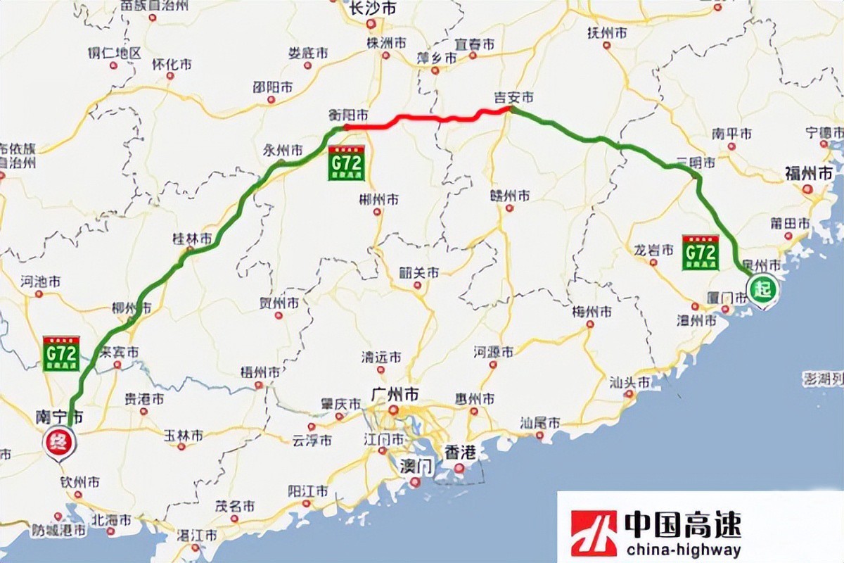 泉南高速(G72):从福建省泉州市通往广西南宁市,中途经过泉州-三明-吉安-衡阳-永州-桂林-柳州-南宁等市,途经福建、江西、湖南、广西等4省,全长1635公里,开车从泉州到南宁需16个小时。