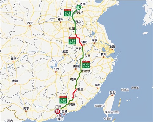 济广高速(G35):从山东省济南市通往广东省广州市,中途经过济南-菏泽-商丘-合肥-景德镇-瑞金-河源-广州等市,是从山东到华南的一条重要交通线,途经山东、河南、安徽、江西、广东等5省,全长2110公里,开车从济南到广州需20个小时。