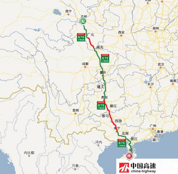兰海高速(G75):从甘肃省兰州通往海南省海口市,中途经过兰州-广元--南充-武胜-重庆-綦江-遵义-贵阳-河池-南宁-钦州-北海-湛江-海口等市,是西北甘肃经四川、重庆、贵州、广西到海南的一条重要交通线,途径甘肃、四川、重庆、贵州、广西、广东、海南等7省市,全长2650公里,开车从兰州到海口需27个小时。