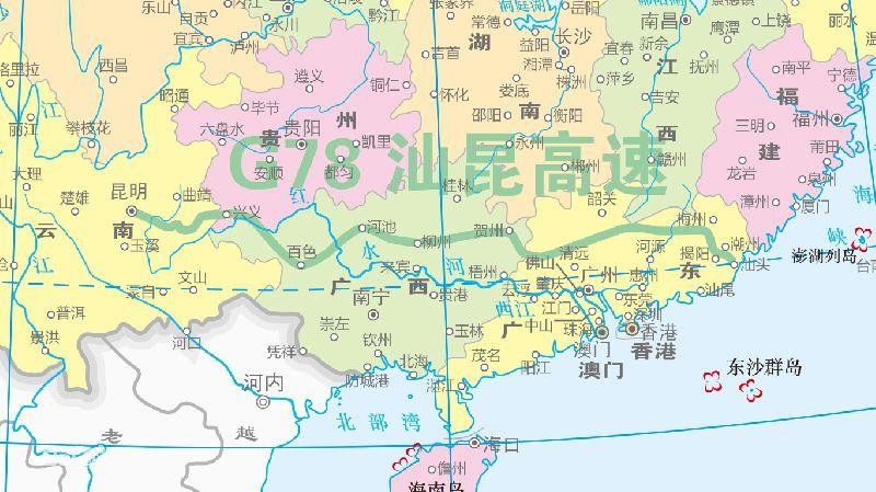 汕昆高速(G78):从广东省汕头市通往云南省昆明市,中途经过汕头-揭阳-梅州-兴宁-龙川-韶关-贺州-柳州-河池-百色-兴义-昆明等市县,途经广东、广西、贵州、云南4省,全长1866.989公里,开车从汕头到昆明需18个小时。