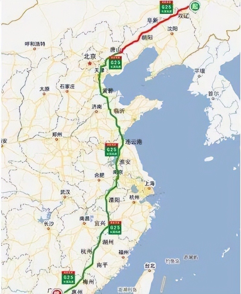 长深高速(G25):从吉林省长春市通往广东省深圳市,中途经过长春-朝阳-唐山-天津-临沂-连云港-南京-宜兴-梅州-深圳等市,是从东北到华南的一条重要的交通线,途经吉林、内蒙古、辽宁、河北、天津、山东、江苏、安徽、浙江、福建、广东等11个省区市,全长3585公里,开车从长春到深圳需35个小时。