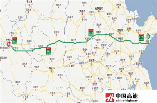 青兰高速(G22):从山东省青岛市通往甘肃省兰州市,中途经过青岛-潍坊-泰安-聊城-邯郸-长治-临汾-庆阳-平凉-定西等市,途径山东、河北、山西、陕西、甘肃5省,全长1795千公里,开车从青岛到兰州要17个小时。