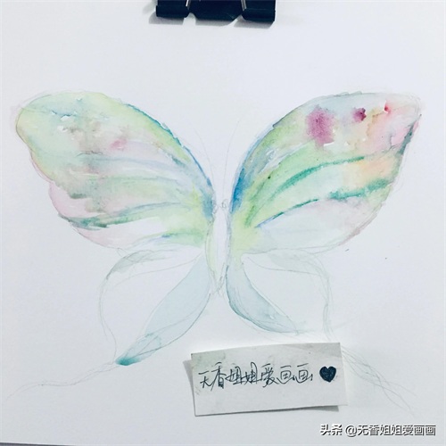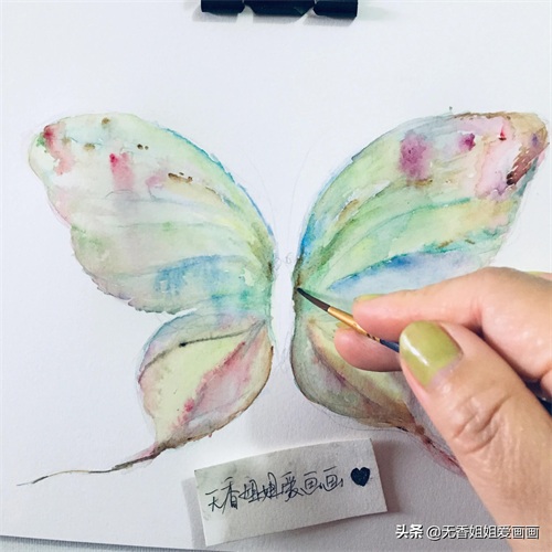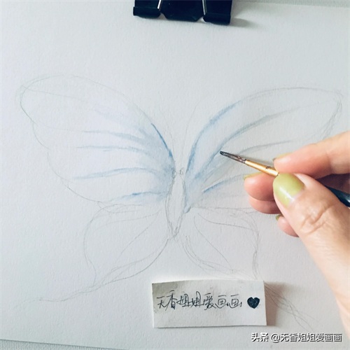 用橡皮擦擦淡铅笔勾画的痕迹,然后用毛笔蘸自己喜欢的 色彩涂抹画出蝴蝶的翅膀上的纹路。(无香姐姐用的是浅蓝色的哟,当然,不一定非要跟着步骤的色彩来涂抹上色哈,亲们,可以自己用自己喜欢的色彩,最好是深色。)如下画面所示