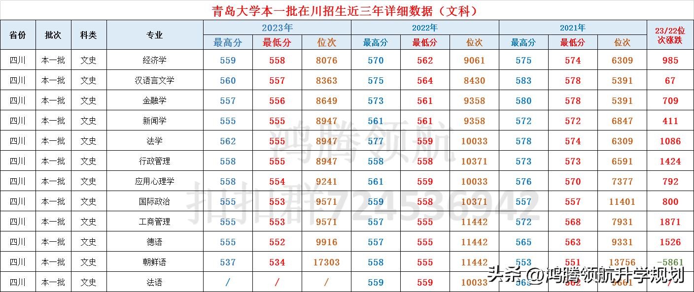青岛大学文科招生专业相对较少,2023年共11个文科专业在川招生,录取分数线为552,排名9916位次,较2022年录取分数位次上涨1526位次,其中“朝鲜语”征集志愿,实际录取分数低于提档线,其余各专业录取位次均上涨。