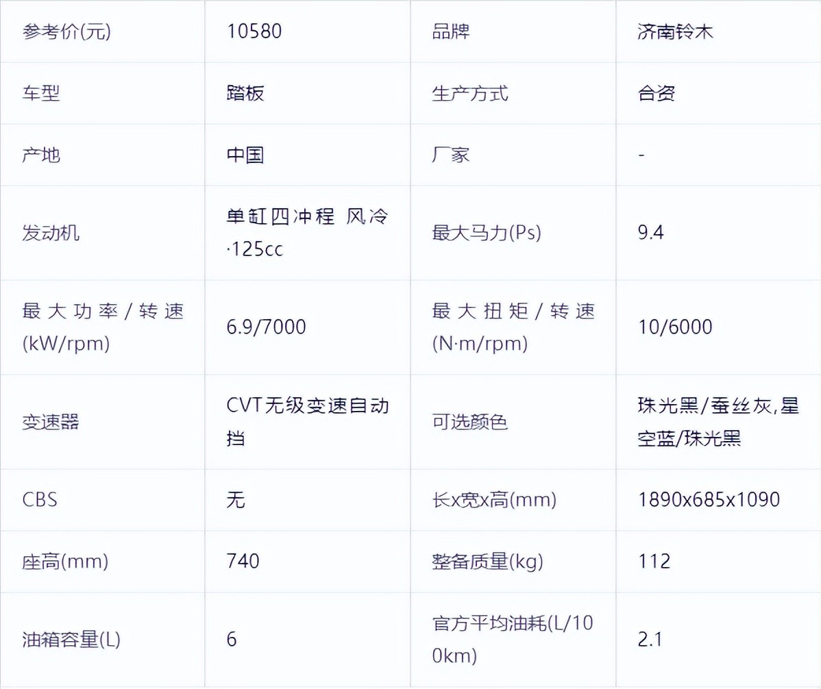 通过配置图我们可以看到,UY125得益于搭载铃木超级芯电喷发动机,实际排量124cc,最大功率6.9kW,最大扭矩9.8N·m,UY125搭载的台发动机具有提速快、油耗低、噪音小的特点,搭配6L的油箱,日常足够使用了在同级车型中也属上游水平。