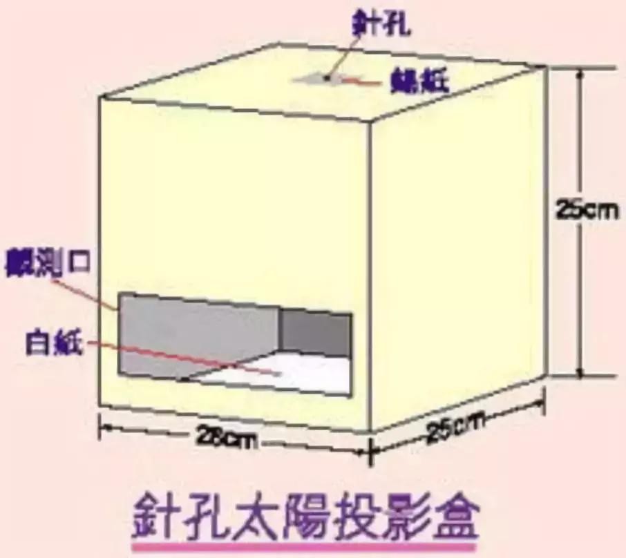 制作针孔投影箱。可用一个1至2米长的纸箱,两端中心各开约10厘米大小的洞,上端用锡纸将洞贴上,再用针在锡纸中心穿一针孔;另一端用白色半透明纸将洞贴上,然后在太阳下试验能否在半透明纸上产生太阳圆面像。要注意,不能用肉眼透过针孔直接观测太阳。
