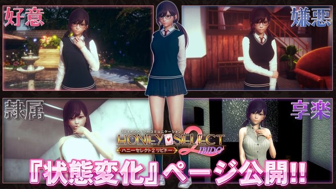 I社新作《Honey Select 2》原计划在3月27日公开游戏系统介绍,但后来因为新冠疫情的原因被推迟到4月3日。今日(4月3日),I社新作《Honey Select 2》公开了一些新情报:游戏中的女性角色总共有4种情感状态。此外,该作还追加了新要素:特殊状态“依存”。
