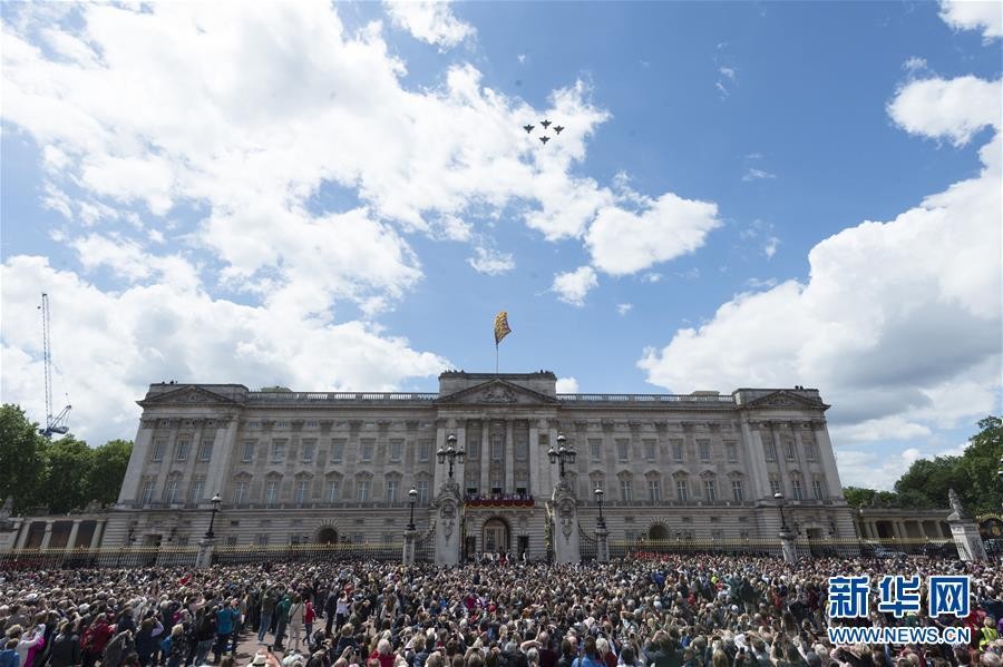 6月8日,在英国伦敦,人们聚集在白金汉宫前庆祝英女王生日。 当日,英国伦敦举行盛大庆典,庆祝英女王93岁官方生日。