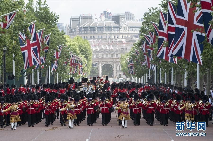 6月8日,在英国伦敦,士兵在英女王生日庆典活动上行进。 当日,英国伦敦举行盛大庆典,庆祝英女王93岁官方生日。 新华社发(雷伊⋅唐摄)