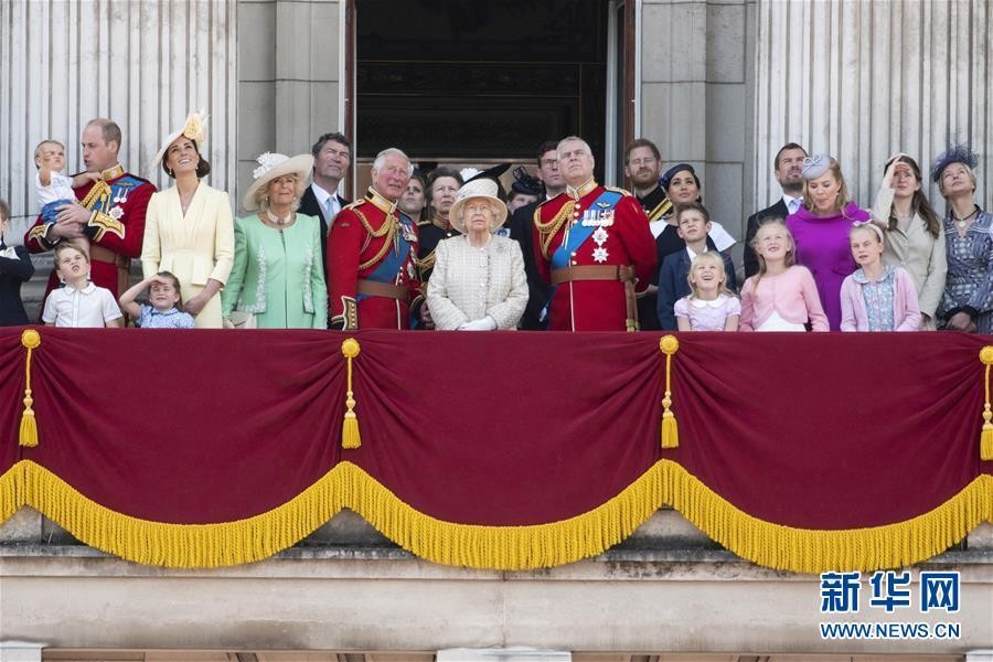 6月8日,在英国伦敦,英女王伊丽莎白二世(中)和王室成员在白金汉宫阳台上庆祝女王生日。 当日,英国伦敦举行盛大庆典,庆祝英女王93岁官方生日。