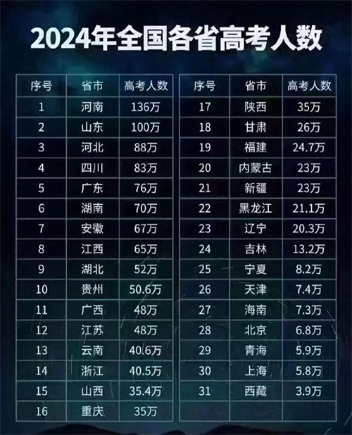 单从高考报名人数来看,2024年河南136万、山东100万,河北88万,人数和难度依然稳居全国前三。