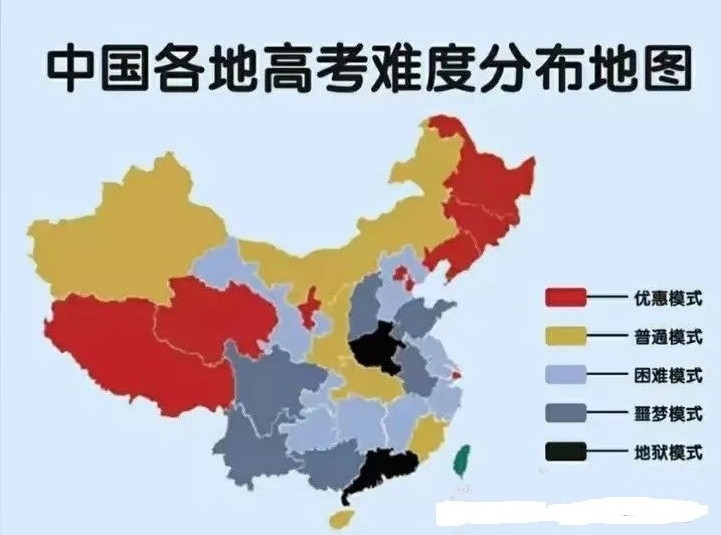 第一梯队(地狱模式):河南、广东;第二梯队(噩梦模式):山西、广西、安徽、云南、四川、山东;第三梯队(困难模式):甘肃、贵州、江苏、河北、江西、湖南、浙江、重庆;第四梯队(普通模式):新疆、内蒙古、黑龙江、陕西、湖北、海南、福建;第五梯队(优惠模式):辽宁、吉林、宁夏、青海、西藏;第六梯队(降分模式):天津、上海、北京。