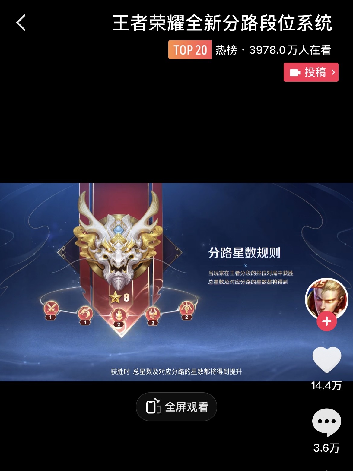 《王者荣耀》全新分路段位系统已随S35赛季更新上线。玩家达到王者段位后,游戏会显示分路星数和王者段位总星数,并在原有王者段位的基础上,增加三个新段位。另外,玩家每提升10星,就可以晋升到新的阶段,并获得新的专属称号。