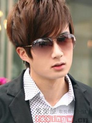 喜欢戴墨镜的男生,怎么打理头发好看呢?这款棕红色系的蓬松短发,搭配上斜刘海下帅气俊脸,真是帅酷有范。