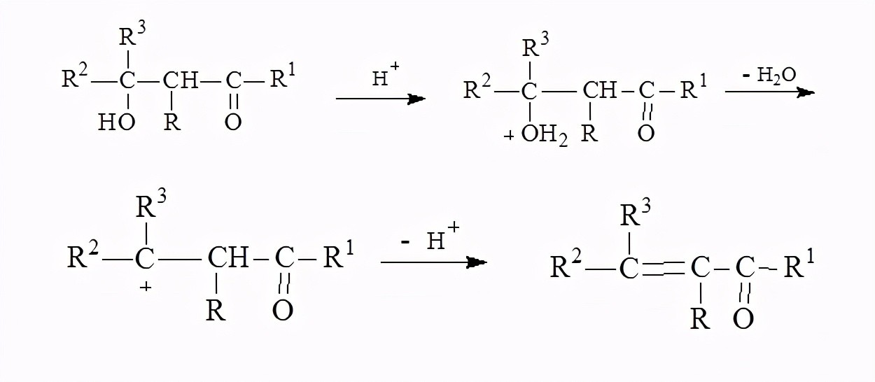 缩合产物b-羟基醛、酮通常经酸催化脱水,或在加热下脱水,生成a、b-不饱和醛、酮。