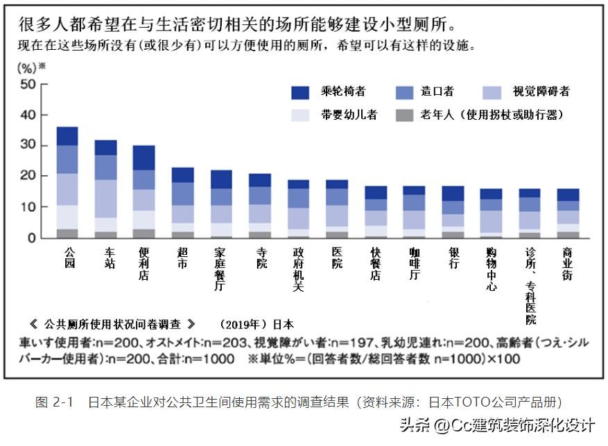 一些发达国家在规划无障碍设施时非常注重对使用者需求进行调研,并将调研结果作为指导空间设计和产品设计的重要依据。下图节选自日本某次公共卫生间使用状况问卷调查的结果,可以看到,人们更希望在各类场所中设置能够满足使用要求的小型厕所,需求排在前5位的场所为公园、地铁站、便利店、超市、小型餐厅。类似这样的调研结论有助于设计师更加了解无障碍设施的使用对象,从而做出更加适用、更具针对性的设计方案。