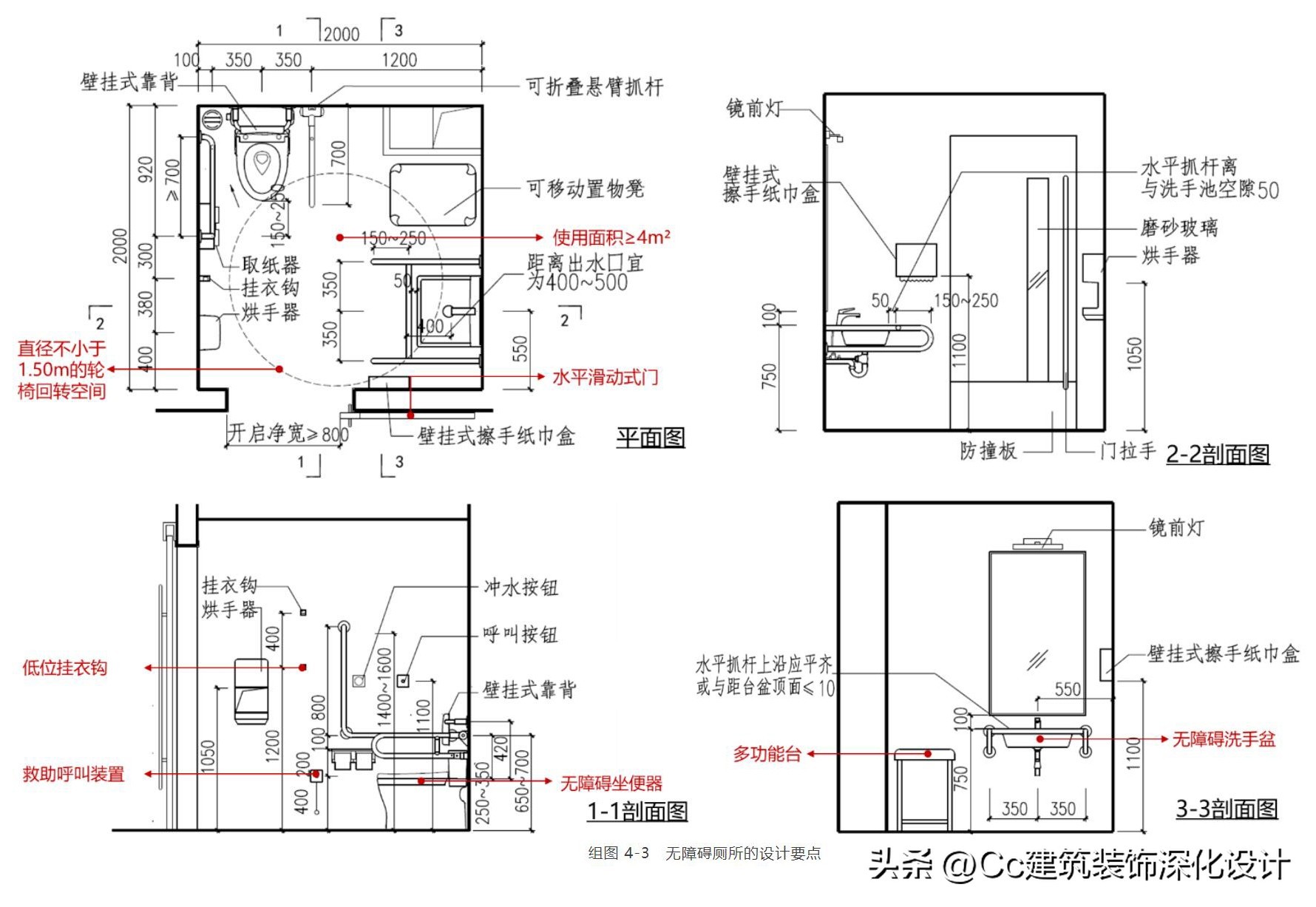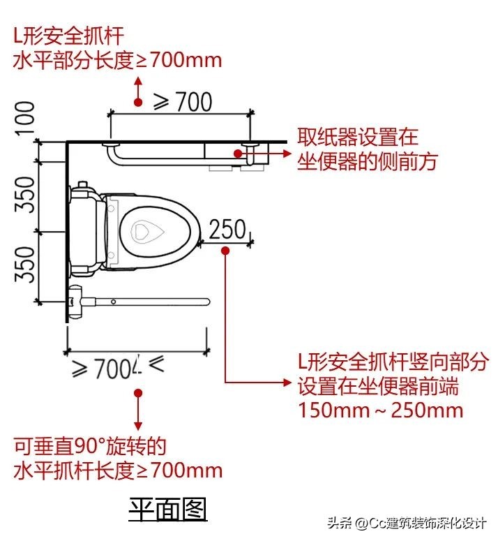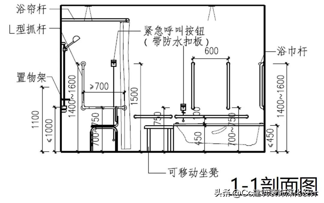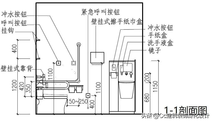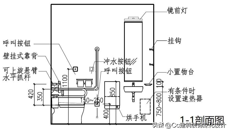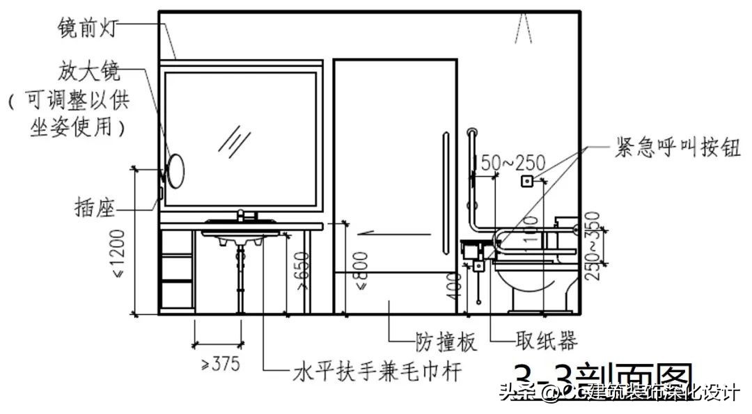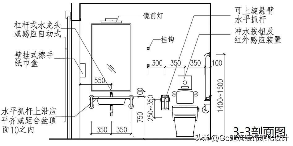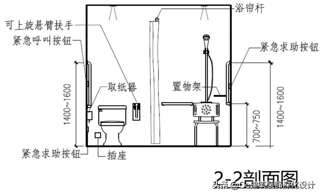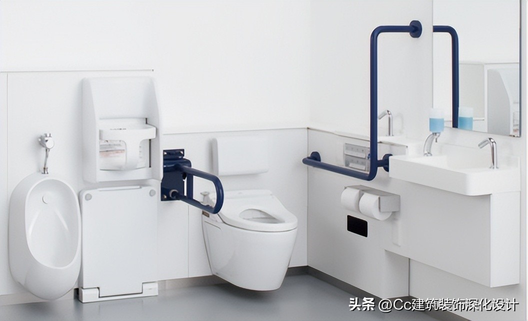 卫生间的无障碍设计应注意符合人体工学尺寸,各类无障碍设施的设计要求如下。