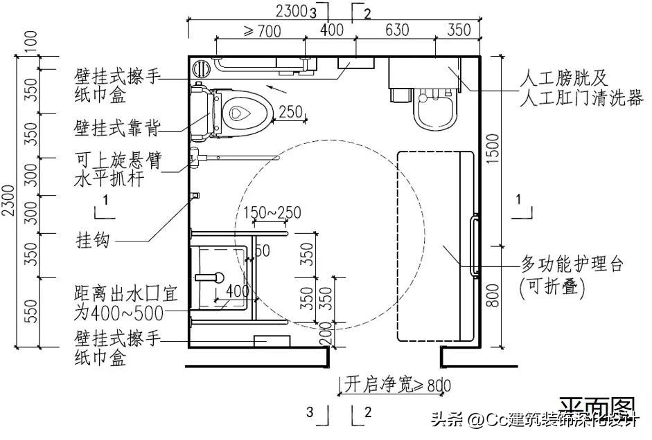 一些无障碍卫生间内虽然设有相应的无障碍设施,但由于平面布局不合理、设施设备位置不当等原因,并不能很好地满足各类人群的使用需求。因此,卫生间的无障碍设计不应仅仅体现在设置有相应的功能空间和设施设备,更应体现在细节层面的周到考虑。
