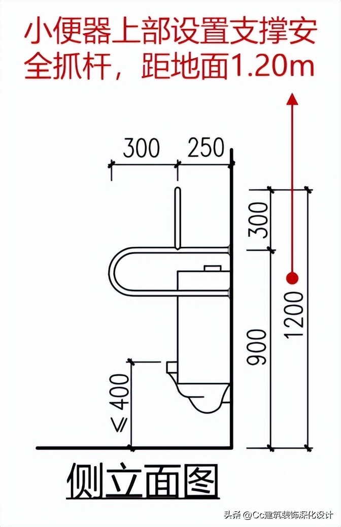 小便器下口距地面高度不应大于400mm;应在小便器两侧设置长度为550mm的水平安全抓杆,距地面高度应为900mm;应在小便器上部设置支撑安全抓杆,距地面高度应为1.20m。