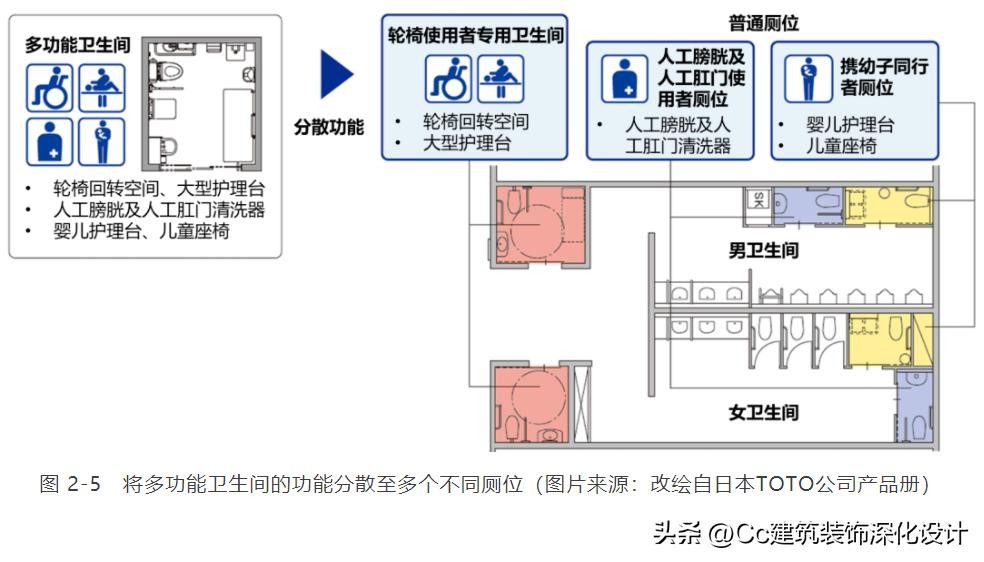 2.4 大中型卫生间分散布置不同类别的厕位,提高使用效率