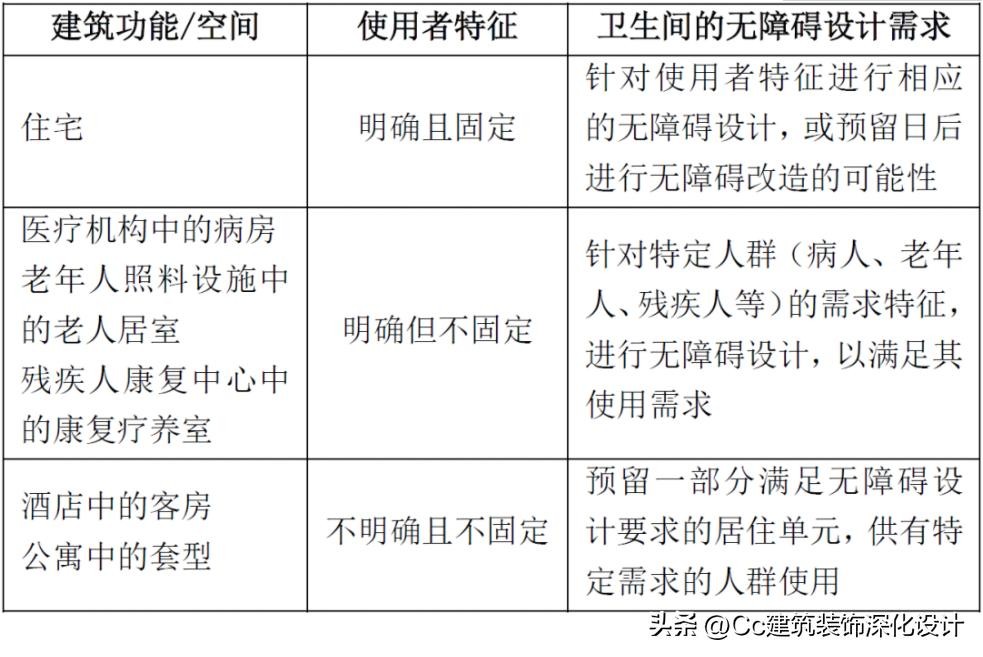 这类卫生间通常面积不大,需要满足使用者盥洗、如厕和洗浴的需求,根据使用者特征的差异,其无障碍设计需求又可进一步细分,如下表所示。
