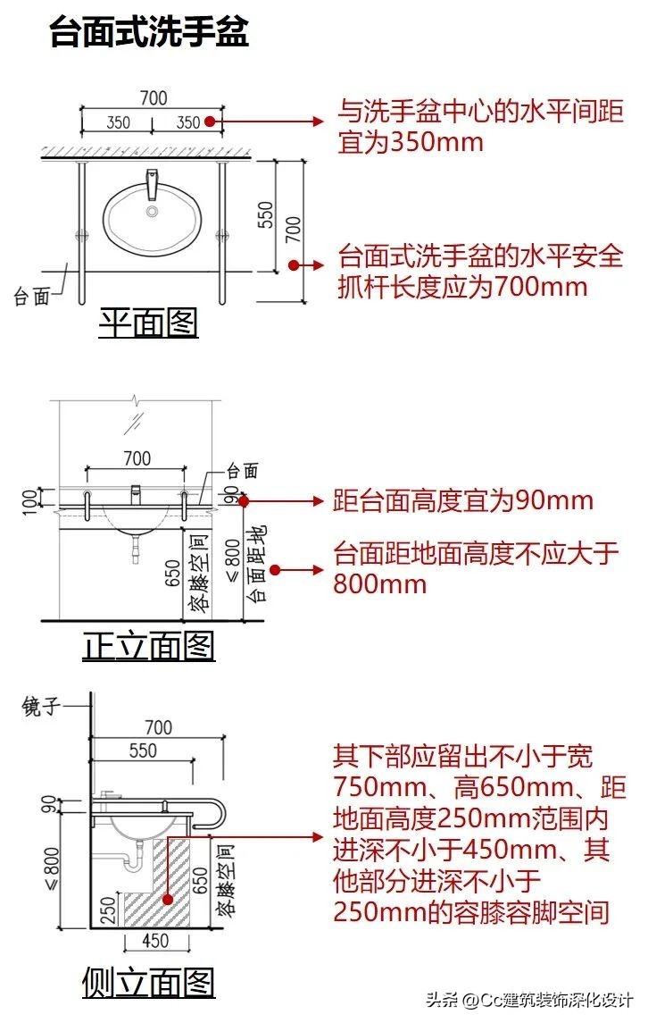 台面距地面高度不应大于800mm,水嘴中心距侧墙不应小于550mm,其下部应留出不小于宽750mm、高650mm、距地面高度250mm范围内进深不小于450mm、其他部分进深不小于250mm的容膝容脚空间;应在洗手盆上方安装镜子,镜子反光面的底端距地面的高度不应大于1.00m;当镜子底端与洗手盆上沿的垂直距离≥100mm时,宜采用有角度的镜子,以方便坐轮椅者使用;出水龙头应采用杠杆式水龙头或感应式自动出水方式;应在洗手盆两侧设置水平安全抓杆;挂墙式洗手盆的水平安全抓杆和洗手盆前方的支撑安全抓杆距地面高度不应大于800mm,且上沿应与台盆顶面平齐,并与洗手盆间留有进深50mm的容手空间;