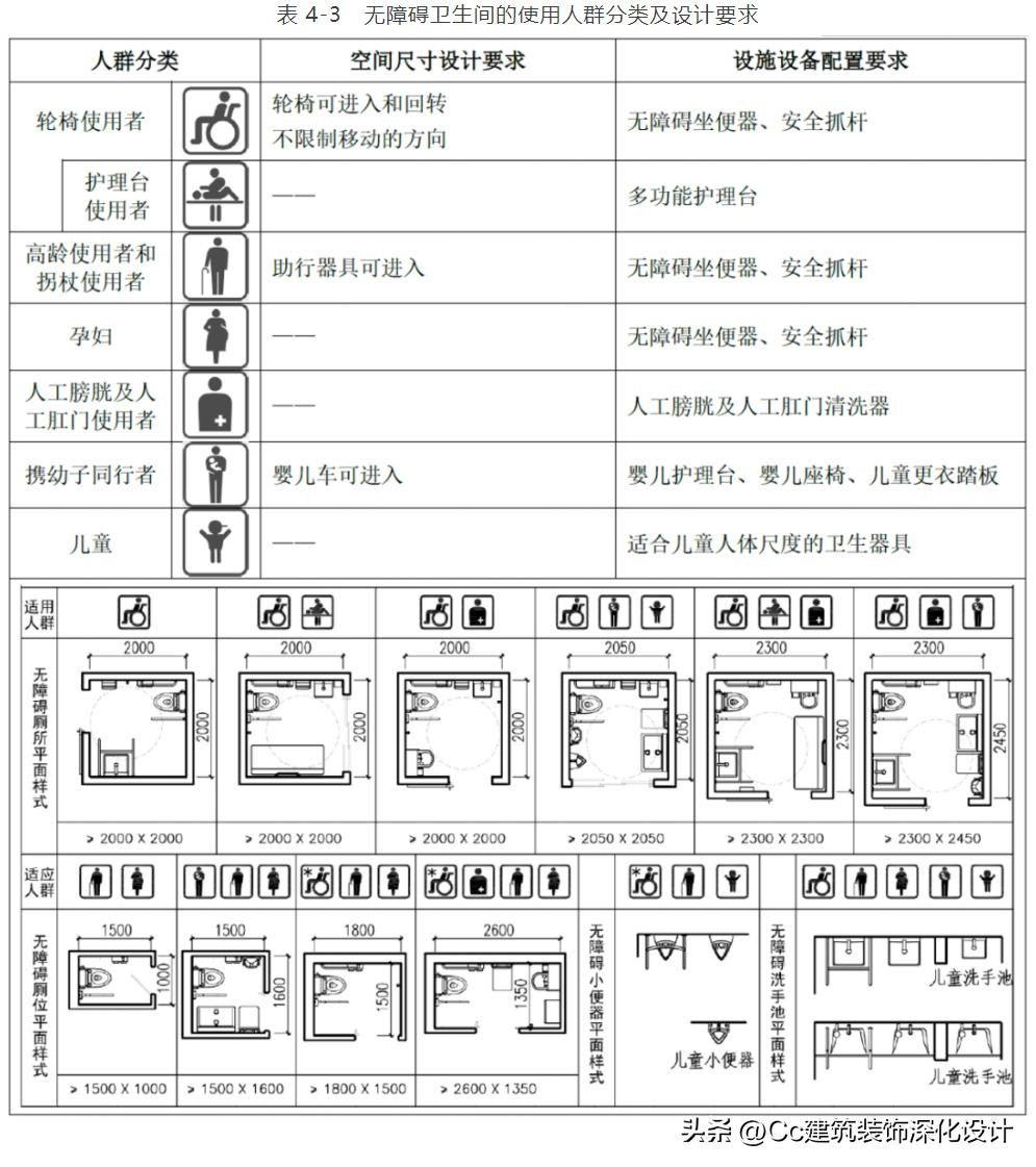 卫生间的无障碍设计应兼顾包括老年人、残疾人、病人、儿童、孕妇等在内的多样化的使用人群需求。各类人群对于卫生间空间尺寸和设施设备的要求,以及满足不同人群使用需求的多功能卫生间如下表所示。
