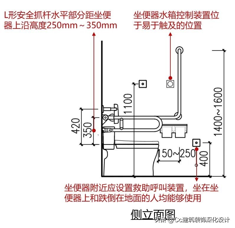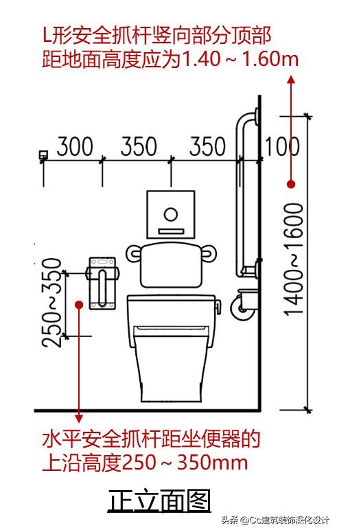 无障碍坐便器两侧应设置安全抓杆,轮椅接近坐便器一侧应设置可垂直或水平90°旋转的水平抓杆,另一侧应设置L形抓杆;轮椅接近无障碍坐便器一侧设置的可垂直或水平90°旋转的水平安全抓杆距坐便器的上沿高度应为250~350mm,长度不应小于700mm;无障碍坐便器另一侧设置的L形安全抓杆,其水平部分距坐便器的上沿高度应为250mm~350mm,水平部分长度不应小于700mm;其竖向部分应设置在坐便器前端150mm~250mm,竖向部分顶部距地面高度应为1.40~1.60m;坐便器水箱控制装置应位于易于触及的位置,应可自动操作或单手操作;取纸器应设置在坐便器的侧前方;在坐便器附近应设置救助呼叫装置,并满足坐在坐便器上和跌倒在地面的人均能够使用。