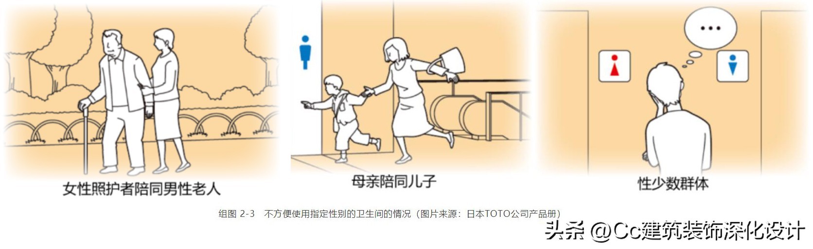 传统的公共卫生间通常是指定性别、男女分开的,这对于一些有特殊人群是不友好的,例如,儿童、老人、有智力障碍或身体障碍的人士在有异性陪同的情况下,就无法进入指定性别的卫生间;一些变性者、同性恋者等性少数群体,在进入指定性别的卫生间时也会遭遇尴尬。针对这一问题,在一些发达国家,无论是大规模集中式的公共卫生间,还是小规模家庭式的卫生间,都会至少设置一处独立的、空间相对宽敞的、不指定性别的多功能卫生间,以满足包括老年人、残疾人、轮椅使用者、携带婴幼儿者、有异性陪同照护的人士、以及性少数群体在内的各类人群的使用需求。