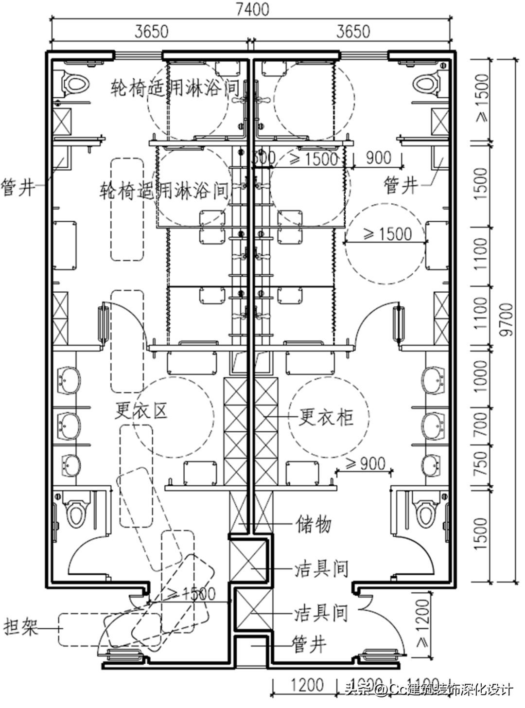 案例14 适用于服务残障人士的体育中心、康乐设施等大中型公共建筑内的无障碍公共浴室