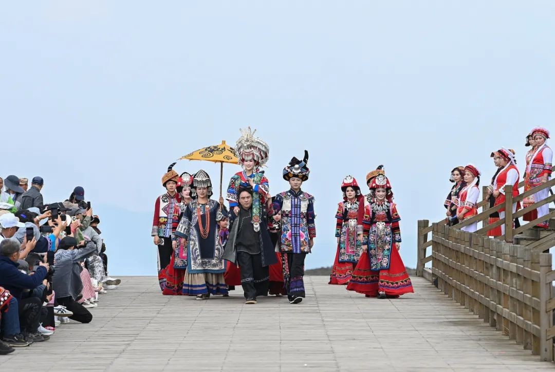 除了村超、村马的竞技赛事,贵州村T的民族服饰盛宴,也早已悄然走进了大众的视野。“村T”,是贵州省乡村非遗民族服饰T台秀,是一个面向全国以及全世界展示非遗服饰的公益T台。去年7月,苗族设计师杨春林,以贵州“村T”为名,发起属于当地老百姓的民族特色服装秀,将苗绣、银饰、非遗美食、芦笙舞、农耕工具等搬上T台,受到了当地村民的热烈欢迎。一时间,村民们也纷纷穿上自己的民族盛装,来到风情园风雨桥秀场中走秀,“贵州村T”由此诞生,并走向了中国国际时装周,走向了全世界。