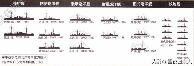 剩下的4万多吨是北洋海军的军舰。连先定,镇两艘铁甲舰是不用说的,这是北洋海军在东亚顾盼自雄的香本,也是当时清朝主战派的定心丸。另有装甲巡洋舰和防护巡洋舰各3艘,即八大远里的另外六远,平均舰龄已逾七年,船身机器多有损耗,日常保养也不尽如人意。还有旧式巡洋舰2艘(超勇、扬威).蚊炮舰6艘(镇东、镇西、镇南、镇北、镇中、镇边),鱼雷舰1艘(福龙),鱼雷艇6艘,练习舰3艘(成远、康济,敏捷),运输舰2艘(利运、海镜),以上共计军舰20艘,鱼雷艇6艘。其中可用于远海作战的主力舰(八大远和超、扬二舰)总吨位为33500吨。截止到1887年,清朝海军计有大小军舰61艘,鱼雷艇9艘,总吨位69843吨,在世界海军强国中排行第10,依次落后于英,法、俄、意、德、西,美、奥、荷(以该年各国海军的战斗舰艇吨位计算,且未计入其他各国鱼雷艇吨位)。
