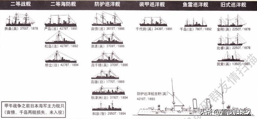 再来看日本方面。根据当时海军年鉴统计,1887年日本海军拥有战斗舰艇27艘,39682吨,七年之后,到1894年中日开战前夕,日本海军已经拥有防护巡洋舰8艘(三景舰:吉野:秋津洲:浪速、高千穗;高雄),装甲巡洋舰1艘(千代田),通报舰1艘(八重山),旧式铁甲舰1艘(扶桑),旧式巡洋舰3艘(筑紫:金刚,比睿),炮舰13艘(天龙:海门:天城:葛城、大和、武藏:赤城、爱宕、摩耶、鸟海;磐城:大岛:风翔),练习舰4艘(筑波、馆山、干珠、满珠),以上31艘军舰合称“第一种军舰”。此外还有“第二种军舰”即鱼雷艇24艘。另有商船4艘,在战时可以加装速射炮,改为辅助巡洋舰。到开战前夜,日本海军总吨位已经达到61373吨,在世界各国海军中排行第11,远东第2。其中一线主力战舰为13艘,总计37200吨,足以同北洋海军相匹敌。