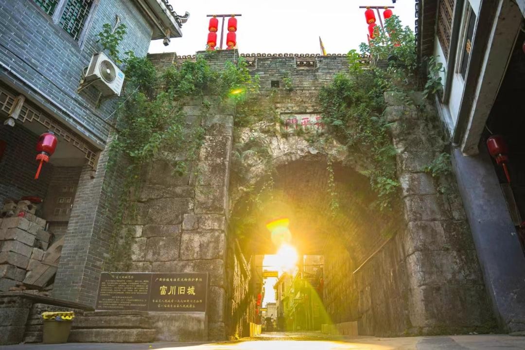 “明富川城”社会与经济文化发展的鼎盛时期为明末清初。城内,井巷交错、集市密布、居民成群。始设有衙署书院、寺祠庙庵、商铺客栈,文娱杂耍等功能设施,且具明清风格的政治文化、宗教祭祀的古建筑亦无所不全,其中最典型的有文武两庙和城隍庙、文昌阁、报恩寺、慈云寺、节孝祠、昭忠祠及养济院、训导署等古代建筑。在城池步道中,井形构造,卵石铺砌,图案秀美,棱圆相接,是堪称广西一绝的古城步道。