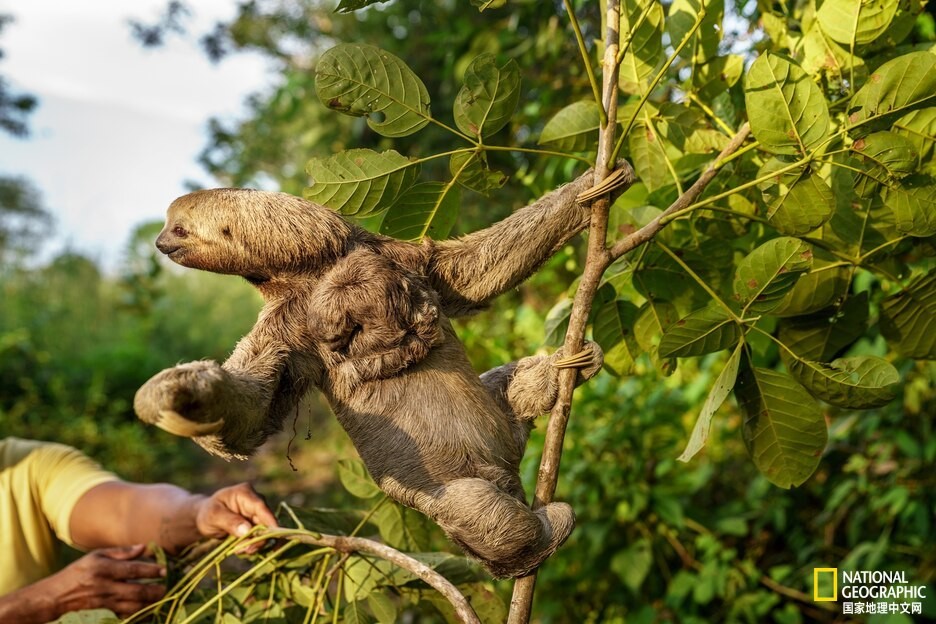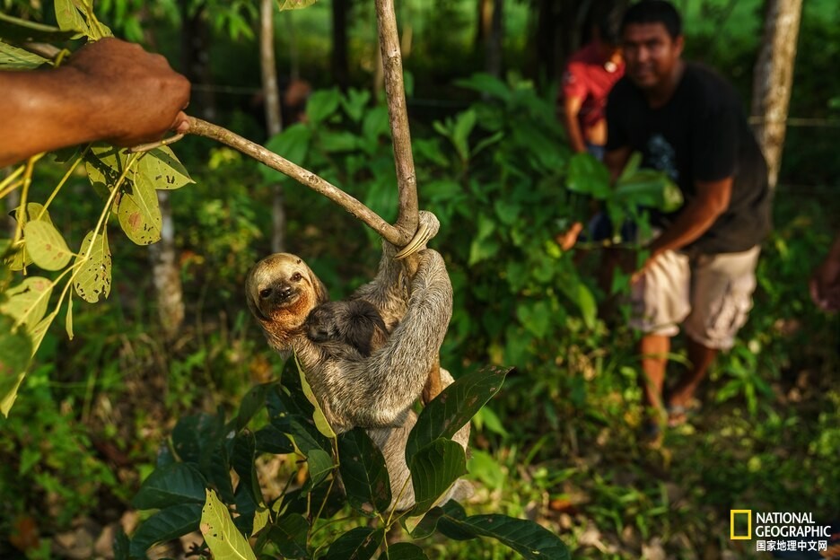 他们把树懒抱回了树底,而树懒妈妈仍然紧紧地抓着她的孩子,冲向安全地带。