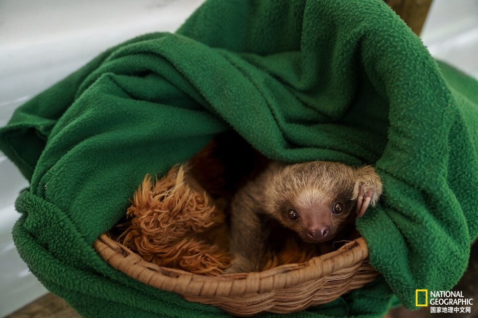一只二趾树懒宝宝从Fundación AIUNAU的一个篮子里探出头来。Plese说,这些篮子像一个舒适的避难所,模仿它们母亲的温暖怀抱。二趾树懒不像三趾树懒那样大量贩卖,因为它们可能对人类更具攻击性。"如果说有什么是我真正感到自豪的,"Plese说,"那就是我从来没有被二趾树懒咬过!"