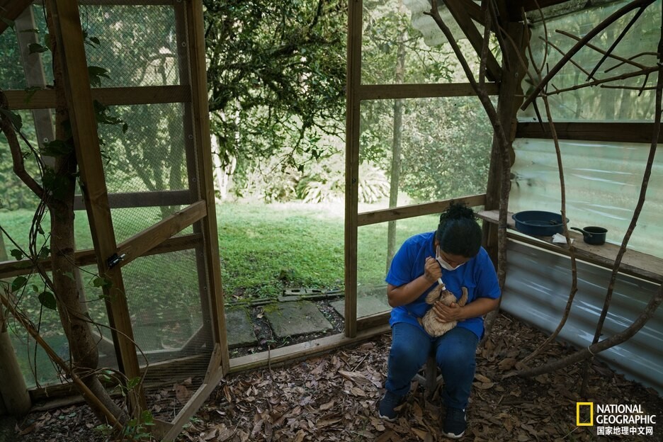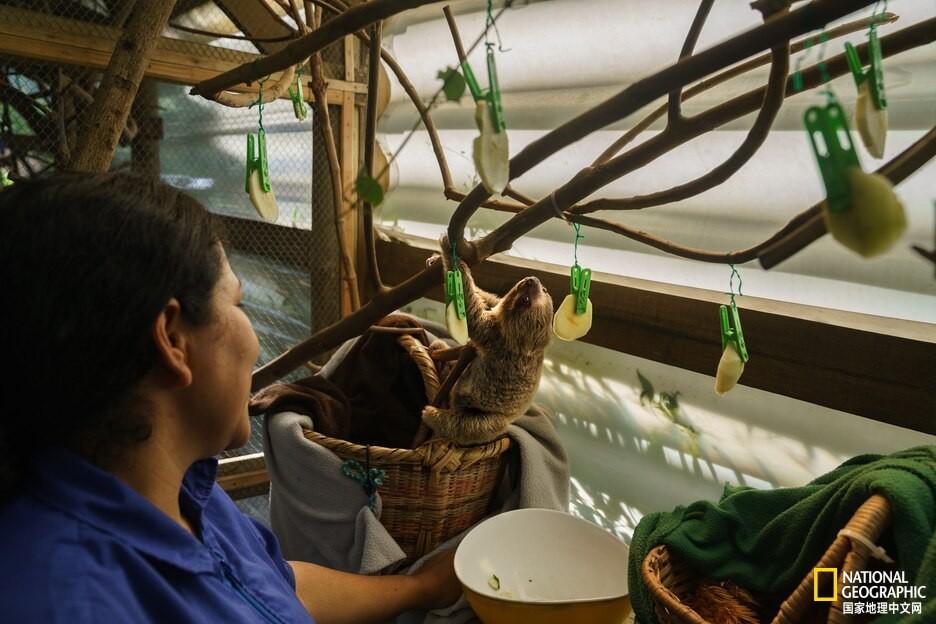 Villada看着一只4个月大的二趾树懒在吃零食。每年,该中心都会收到来自地区野生动物管理局或公众送来的几十只树懒。Plese说,偷猎者有时会把树懒的指甲剪得很厉害,甚至切断它们的手指。有些人拔掉了双趾树懒的牙齿,防止它们攻击人。还有树懒患上营养不良。"Plese说:"有时它们来这里是为了平静地死去。