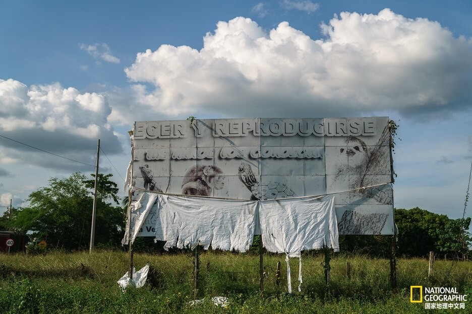 科尔多瓦省蒙特里亚外的一条公路上有一个破旧的标志,教育司机保护野生动物,包括树懒、猴子和乌龟。科尔多瓦长期以来一直是哥伦比亚非法树懒贸易的中心。