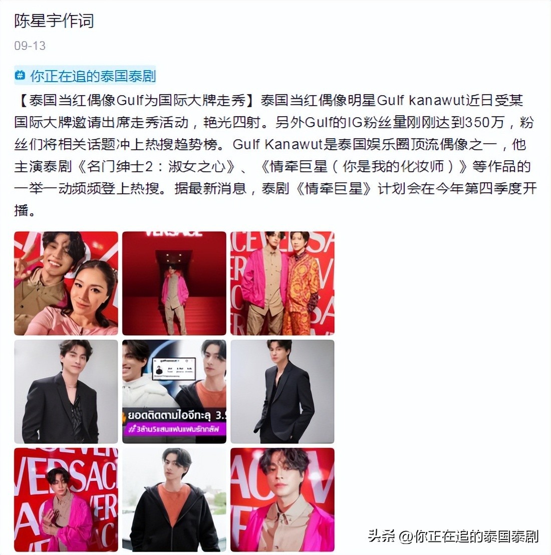 【泰国当红偶像Gulf为国际大牌走秀】泰国当红偶像明星Gulf kanawut近日受某国际大牌邀请出席走秀活动,艳光四射。另外Gulf的IG粉丝量刚刚达到350万,粉丝们将相关话题冲上热搜趋势榜。Gulf Kanawut是泰国娱乐圈顶流偶像之一,他主演泰剧《名门绅士2:淑女之心》、《情牵巨星(你是我的化妆师)》等作品的一举一动频频登上热搜。据最新消息,泰剧《情牵巨星》计划会在今年第四季度开播。