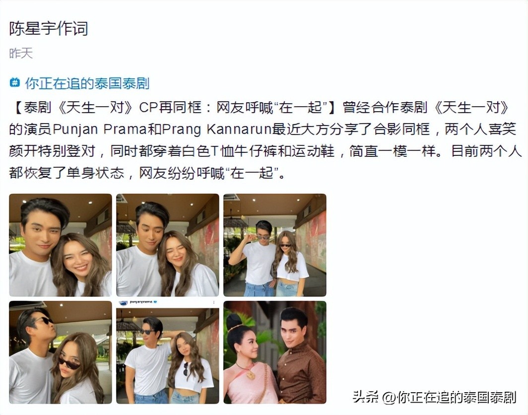 【泰剧《天生一对》CP再同框:网友呼喊“在一起”】曾经合作泰剧《天生一对》的演员Punjan Prama和Prang Kannarun最近大方分享了合影同框,两个人喜笑颜开特别登对,同时都穿着白色T恤牛仔裤和运动鞋,简直一模一样。目前两个人都恢复了单身状态,网友纷纷呼喊“在一起”。