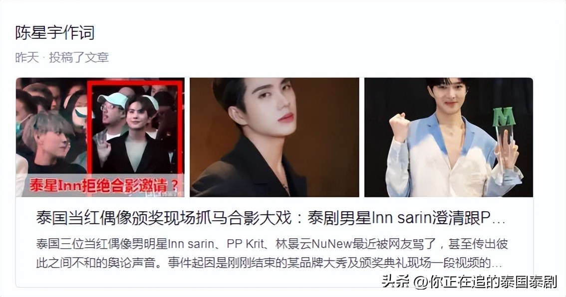 泰国当红偶像颁奖现场抓马合影大戏:泰剧《奇迹小熊先生》男星Inn sarin澄清跟PPKrit和林景云NuNew不和的传闻