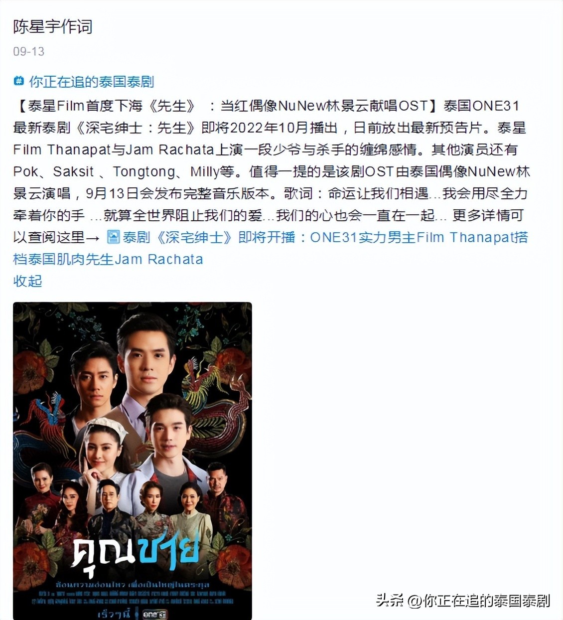 【泰星Film首度下海《先生》 :当红偶像NuNew林景云献唱OST】泰国ONE31最新泰剧《深宅绅士:先生》即将2022年10月播出,日前放出最新预告片。泰星Film Thanapat与Jam Rachata上演一段少爷与杀手的缠绵感情。其他演员还有Pok、Saksit 、Tongtong、Milly等。值得一提的是该剧OST由泰国偶像NuNew林景云演唱,9月13日会发布完整音乐版本。歌词:命运让我们相遇...我会用尽全力牵着你的手 ...就算全世界阻止我们的爱...我们的心也会一直在一起...