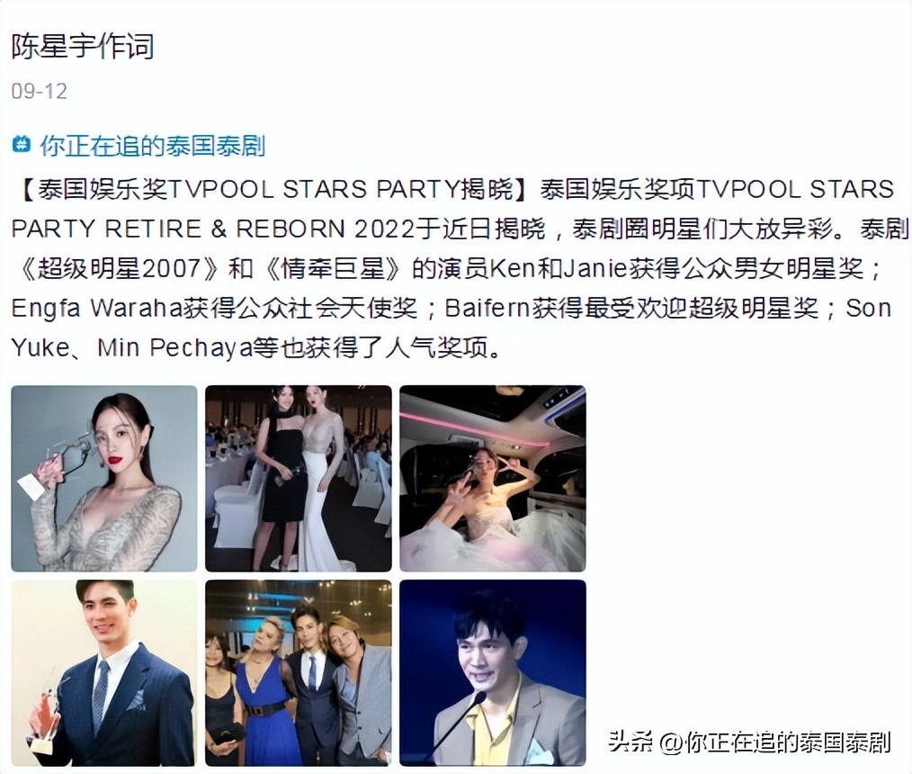 【泰国娱乐奖TVPOOL STARS PARTY揭晓】泰国娱乐奖项TVPOOL STARS PARTY RETIRE & REBORN 2022于近日揭晓,泰剧圈明星们大放异彩。泰剧《超级明星2007》和《情牵巨星》的演员Ken和Janie获得公众男女明星奖;Engfa Waraha获得公众社会天使奖;Baifern获得最受欢迎超级明星奖;Son Yuke、Min Pechaya等也获得了人气奖项。