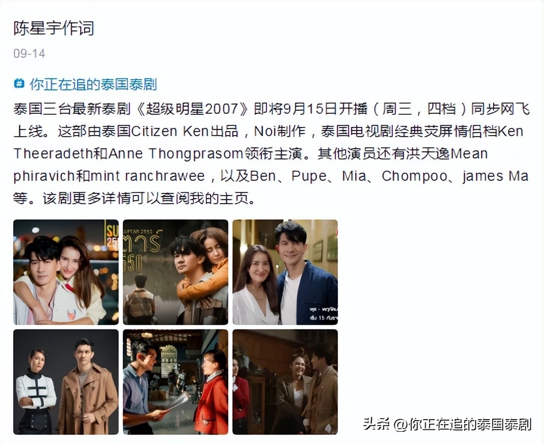 泰国三台最新泰剧《超级明星2007》即将9月15日开播(周三,四档)同步网飞上线。这部由泰国Citizen Ken出品,Noi制作,泰国电视剧经典荧屏情侣档Ken Theeradeth和Anne Thongprasom领衔主演。其他演员还有洪天逸Mean phiravich和mint ranchrawee,以及Ben、Pupe、Mia、Chompoo、james Ma等。该剧更多详情可以查阅我的主页。