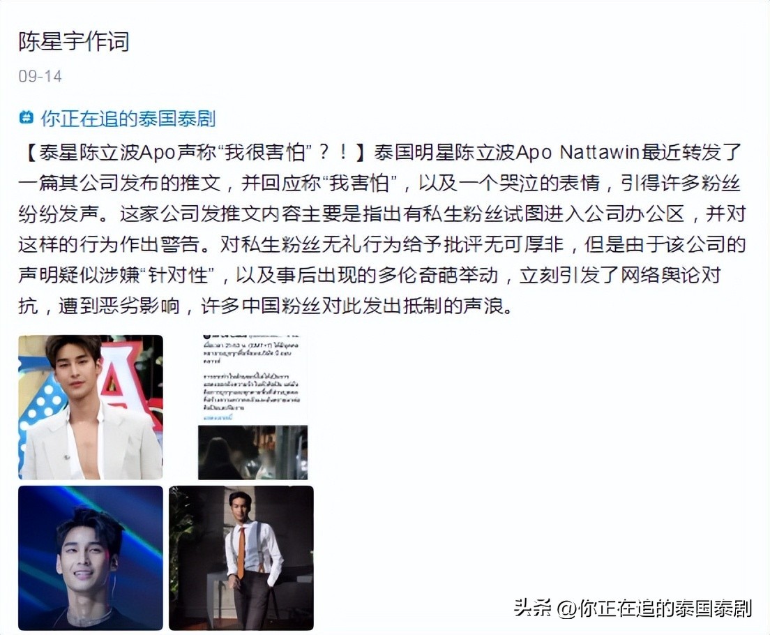 【泰星陈立波Apo声称“我很害怕”?!】泰国明星陈立波Apo Nattawin最近转发了一篇其公司发布的推文,并回应称“我害怕”,以及一个哭泣的表情,引得许多粉丝纷纷发声。这家公司发推文内容主要是指出有私生粉丝试图进入公司办公区,并对这样的行为作出警告。对私生粉丝无礼行为给予批评无可厚非,但是由于该公司的声明疑似涉嫌“针对性”,以及事后出现的多伦奇葩举动,立刻引发了舆论,许多中国粉丝对此发出声浪。