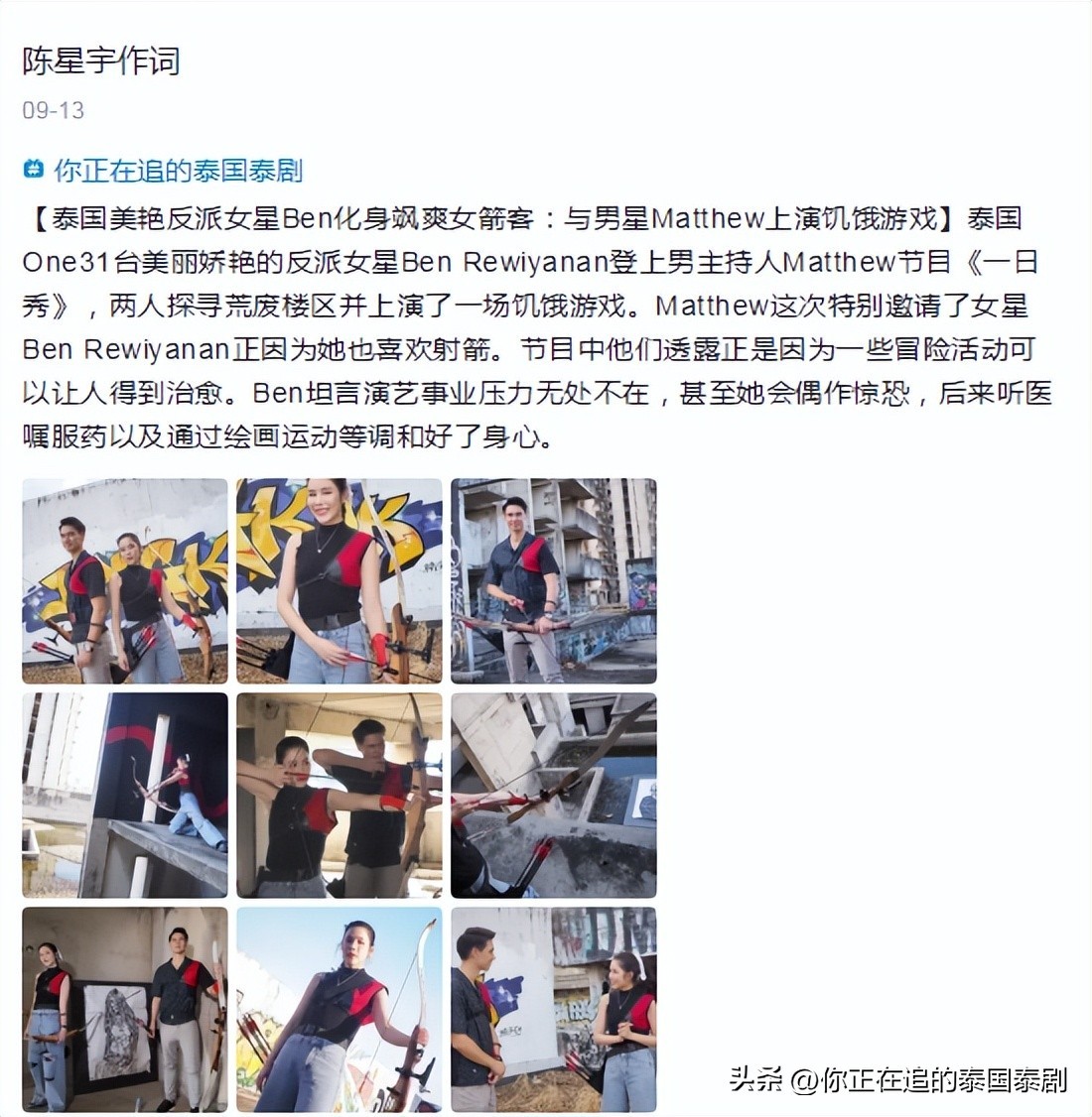 【泰国美艳反派女星Ben化身飒爽女箭客:与男星Matthew上演饥饿游戏】泰国One31台美丽娇艳的反派女星Ben Rewiyanan登上男主持人Matthew节目《一日秀》,两人探寻荒废楼区并上演了一场饥饿游戏。Matthew这次特别邀请了女星Ben Rewiyanan正因为她也喜欢射箭。节目中他们透露正是因为一些冒险活动可以让人得到治愈。Ben坦言演艺事业压力无处不在,甚至她会偶作惊恐,后来听医嘱服药以及通过绘画运动等调和好了身心。