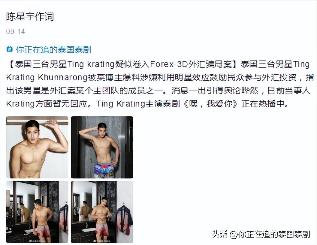 【泰国三台男星Ting krating疑似卷入Forex-3D案】泰国三台男星Ting Krating Khunnarong被某博主爆料涉嫌利用明星效应鼓励民众参与外汇投资,指出该男星是外汇案某个主团队的成员之一。消息一出引得舆论哗然,目前当事人Krating方面暂无回应。Ting Krating主演泰剧《嘿,我爱你》正在热播中。